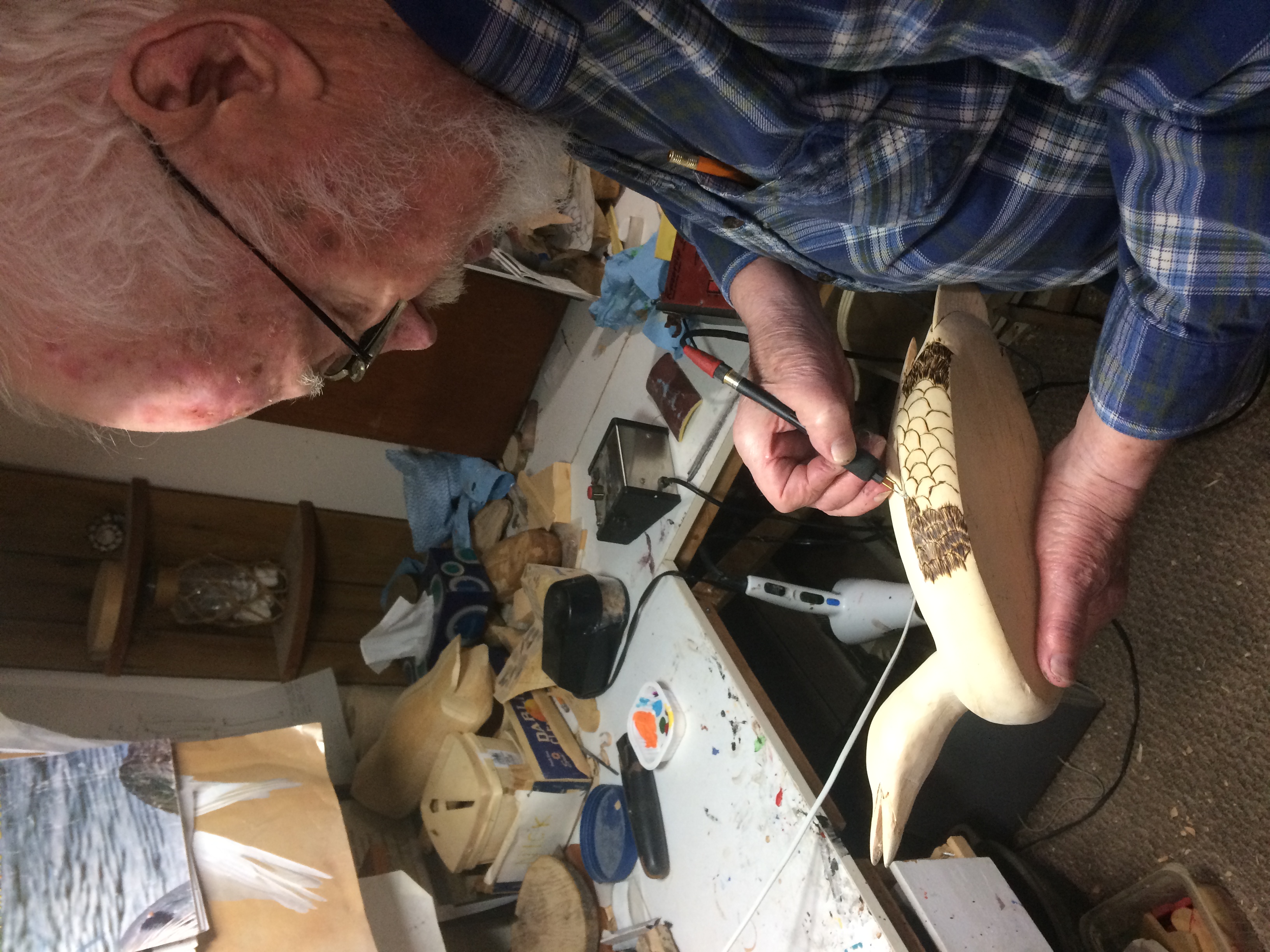 The benches and shelves are crowded with carvings, paints, patterns, wood disks, chisels, burning tools, and works in progress, both his and his students’. Hanging from the shelves are wads of paper patterns of birds and other items to carve. In the next room are his band saw, several walking sticks, more equipment, and wood. Dave was working on a cardinal, soldering on its metal feet. “It took me about two days to make,” he said. He showed me how he burns the pattern of feathers onto the body of a bird.